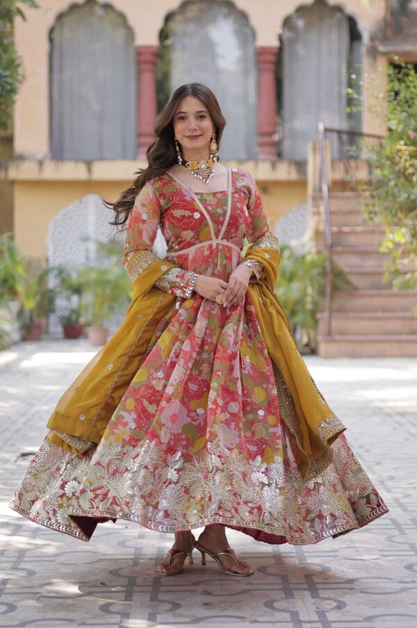 🧵 Fabric & Work: Digital Printed Russian Silk with Foil Embroidery Zari & Sequins Work