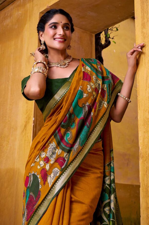 Mustard Yellow Kalamkari Printed Chanderi Saree with Zari Weaving Border